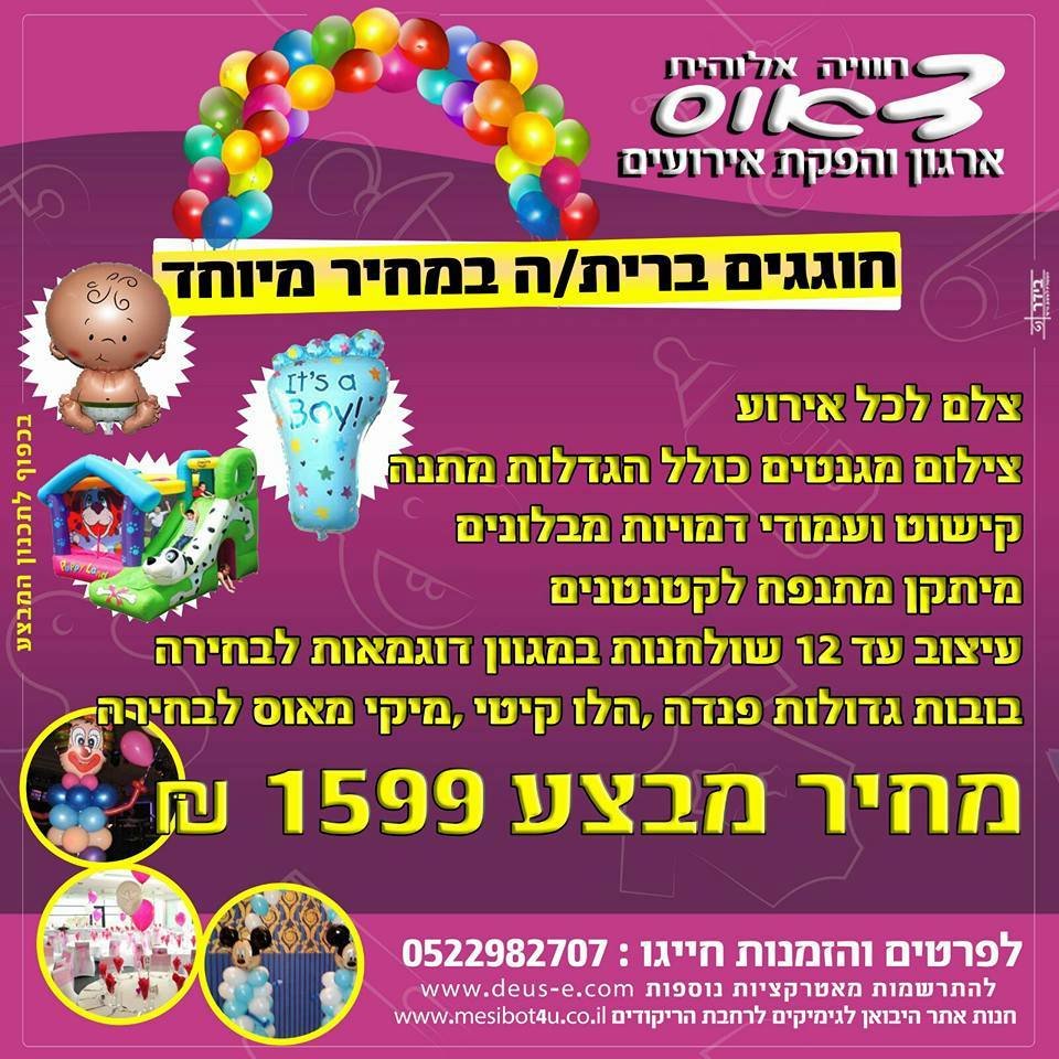 צלם הכולל מגנטים+עמודי דמויות מבלונים מתנפחים+מתקן מתנפח לקטנטנים+בלונים מעוצבים לשולחנות.מותנה בהצגת הקופון בלבד ובתיאום מראש.
